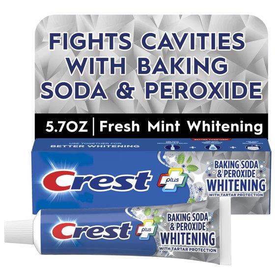 Crest Plus Baking Soda & Peroxide Toothpaste with Tartar Protection gives you a cavity treatment that helps take care of your mouth. Regular brushing can help protect your teeth and strengthen weak spots to help fight cavities. The formula contains baking soda and peroxide, and it whitens your teeth by removing surface stains. Plus, it fights tartar buildup, and it'll leave your breath feeling fresh.
