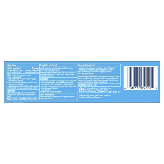 Active Ingredients: Stannous Fluoride (0.15 w/v Fluoride Ion) (0.454 %), Anticavity, Antigingivitis, Antisensitivity Toothpaste. Inactive Ingredients: Water, Sorbitol, Hydrated Silica, Sodium Lauryl Sulfate, Sodium Gluconate, Carrageenan, Flavor, Sodium Citrate, Xanthan Gum, Zinc Citrate, Glycine, Sodium Hydroxide, Stannous Chloride, Sodium Saccharin, Sucralose, Mica, Titanium Dioxide, Blue 1.