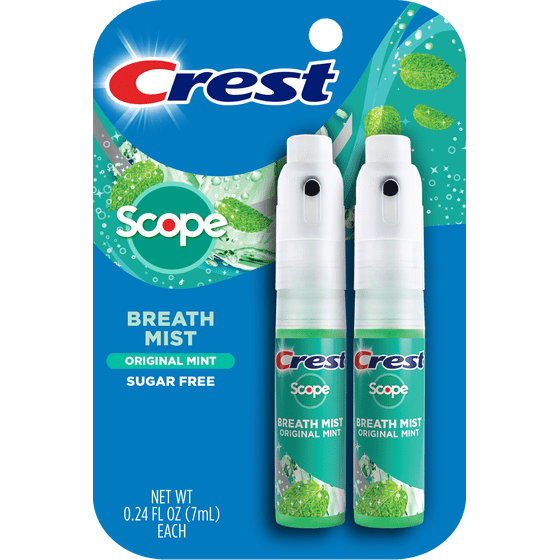 Keep your mouth fresh any time of the day or night with Crest Scope Long-Lasting Mint Breath Mist, 0.24 fl oz (Pack of 2). It has a simple no-cap delivery system, which is designed for easy and effortless one-handed use. The small size allows you to keep it discreetly in your pocket, desk drawer, gym bag or tote. This sugar-free mint mist provides an immediate refreshing sensation with just one spray.