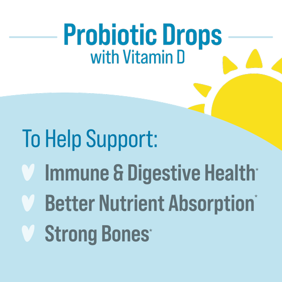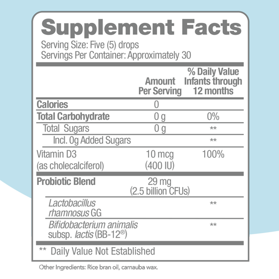 Five (5) Drops: Calories 0; Total Carbohydrate 0 g (0% *Percent Daily Value Infants Through 12 Months) (Total Sugars 0 g [**Daily Value Not Established] [Incl. 0 g Added Sugars (**)]); Vitamin D (as Cholecalciferol) 10 mcg (100%*); Proprietary Blend Total Cultures 2.5 Billion CFUs (Lactobacillus Rhamnosus GG [LGG] [**], Bifidobacterium Animalis Subsp. Lactis [BB-12] [**]); Rice Brain Oil; Carnauba Wax; Sucrose (Adds a Dietarily Insignificant Amount of Sugar. Not a Reduced Calorie Food); Maltodextrin; Sodium Ascorbate