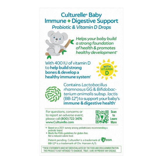 - FROM THE PEDIATRICIAN RECOMMENDED PROBIOTIC BRAND: Build a strong foundation for infants with Culturelle Baby Immune & Digestive Support Probiotic + Vitamin D Drops formulated with Lactobacillus rhamnosus GG (LGG) and Bifidobacterium animalis subsp. lactis BB-12 probiotics: Two of the most clinically studied probiotics.