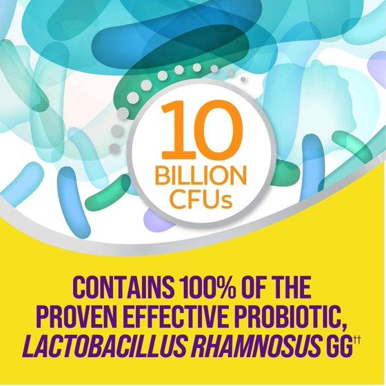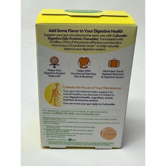 Heading Purpose Dietary Supplement Manufacturer Ihealth Active Ingredients 1 Tablet: Calories 5; Total Carbohydrates 1 g (Sugar 0 g); Vitamin C 10 mg; Sodium 10 mg; Lactobacillus GG 10 Billion Cells (Guaranteed Potency Through Date on Box When Stored According to Instructions on Package); Inulin (Chicory Root Extract) 200 mg; Xylitol; Mannitol (Corn or Wheat); Glyceryl Behenate; Microcrystalline Cellulose; Sucrose; Maltodextrin; Magnesium Stearate; Sodium Ascorbate; Citric Acid; Natural and Artificial Flavor Directions Suggested use for adults and children 4 years of age and older: As a dietary supplement, chew one (1) tablet per day to support digestive and immune health. Continued daily use is suggested. If experiencing digestive upset, two (2) tablets daily are recommended until discomfort subsides. When traveling, chew two (2) tablets daily throughout the trip. Best results if started two to three days prior to travel. Consult your medical professional for more information. Storage: Store in a cool, dry place away from direct sunlight. Must not exceed 75 degrees Fahrenheit. Uses Culturelle with probiotic lactobacillus GG, the most clinically studied probiotic, and inulin a prebiotic, naturally replaces the non-beneficial bacteria, returning healthy balance to your intestinal tract.* Take daily to: Help boost digestion and overall health.* Help reduce the likelihood of gas and bloating.* Help support the immune system and general well-being.* Help minimize travel associated stomach and digestive issues.* Safe for everyday, long-term use. Natural and artificial flavors. Contains none of the following: added colors, preservatives, dairy, yeast, gluten or lactose. *These statements have not been evaluated by the Food and Drug Administration. This product is not intended to diagnose, treat, cure or prevent any disease. Warnings THIS PRODUCT IS INTENDED FOR USE UNDER ADULT SUPERVISION ONLY. KEEP OUT OF REACH OF CHILDREN. Not intended for children under 3 years of age due to risk of choking. This product should not be used by those with immune problems unless directed by a physician. hide