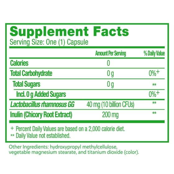Lactobacillus GG, Inulin (Chicory Root Extract), Other Ingredients: hydroxypropyl methylcellulose, sucrose?, maltodextrin, sodium ascorbate, vegetable magnesium stearate, silicon dioxide, and titanium dioxide (color)
