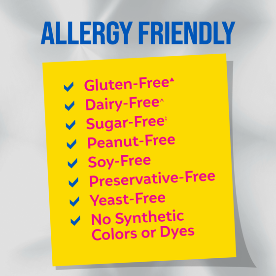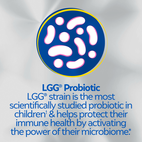 - *THESE STATEMENTS HAVE NOT BEEN EVALUATED BY THE FOOD AND DRUG ADMINISTRATION. THIS PRODUCT IS NOT INTENDED TO DIAGNOSE, TREAT, CURE OR PREVENT ANY DISEASE. ± Based on a 2023-24 survey among pediatricians recommending a kids/baby probiotic brand. ‡ Contains sucrose which adds a dietarily insignificant amount of sugar. Not a reduced calorie food. ▲ While this product contains an ingredient sourced from wheat, it meets the FDA’s definition of gluten free (less than 20 ppm gluten). ^ While there are no dairy-derived ingredients in the product, it is produced in a facility that also handles dairy ingredients. Culturelle is a trademark of dsm-firmenich group.