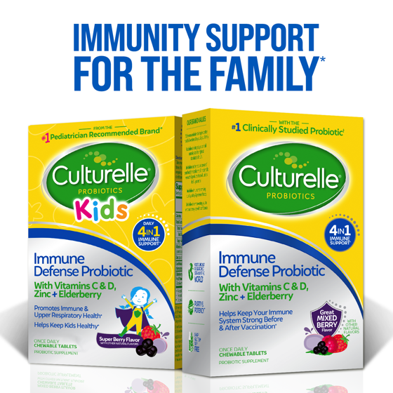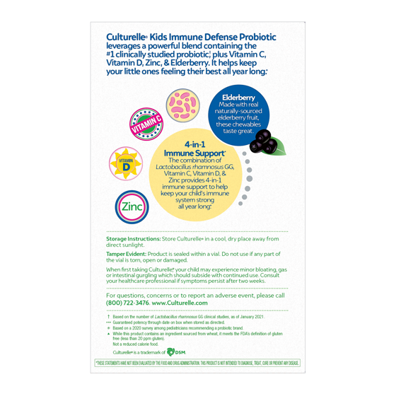- MULTI BENEFIT FORMULA: Culturelle Kids Immune Defense Probiotics made with real elderberry fruit, Zinc, Vitamin C and Vitamin D; tasty and convenient chewables that help support your child’s immune system. It works naturally with your child’s microbiome, where 70% of their immune system resides* and promotes immune and upper respiratory health*.