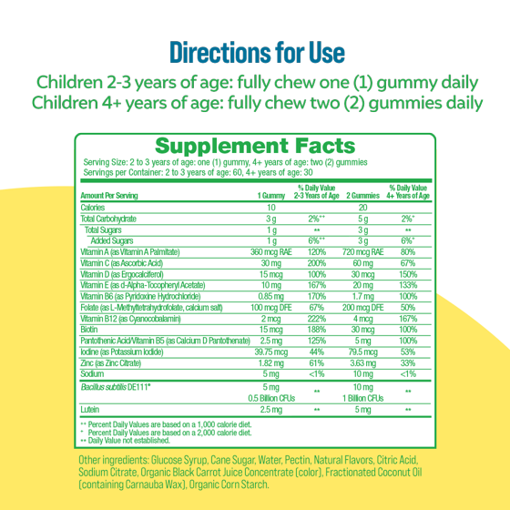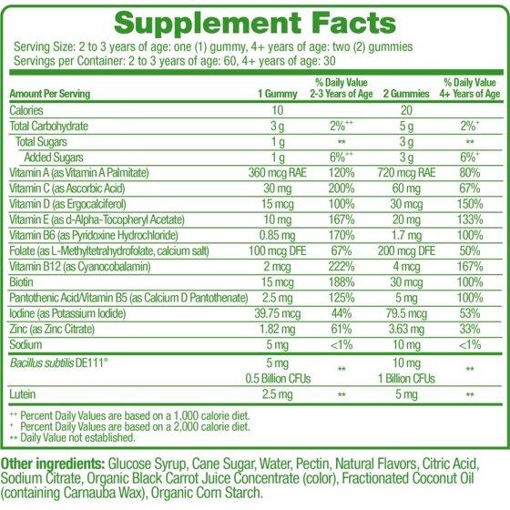 Bacillus subtilis DE111?, Vitamin A (as Vitamin A Palmitate), Vitamin C (as Ascorbic Acid), Vitamin D (as Ergocalciferol), Vitamin E (as d-Alpha-Tocopheryl Acetate), Vitamin B6 (as Pyridoxine Hydrochloride), Folate (as L-Methyltetrahydrofolate, calcium salt), Vitamin B12 (as Cyanocobalamin), Biotin, Pantothenic Acid/Vitamin B5 (as Calcium D Pantothenate), Iodine (as Potassium Iodide), Zinc (as Zinc Citrate), Sodium, Glucose Syrup, Cane Sugar, Water, Pectin, Natural Flavors, Citric Acid, Sodium Citrate, Organic Black Carrot Juice Concentrate (color), Fractionated Coconut Oil (containing Carnauba Wax), Organic Corn Starch.