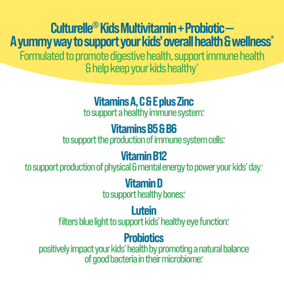 - SAFE AND EASY TO TAKE: Mouthwatering flavor tested &approved by kids; chew 1 Culturelle Kids Multivitamin + Probiotic daily for children ages 2-3, and 2 gummies daily for children ages 4 and up; can be taken with or without food at any time of the day