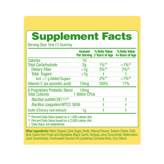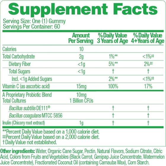 - PROVEN PROBIOTIC STRAINS: Formulated with a unique blend of probiotics and prebiotic veggie fiber, these naturally flavored gummies work to harness the power of your kid’s gastrointestinal microbiome.
