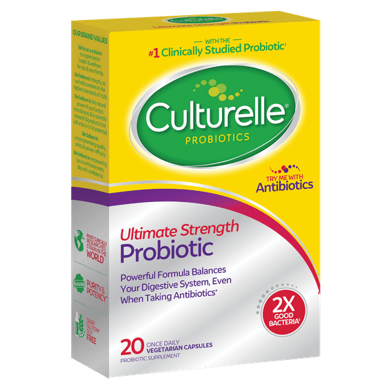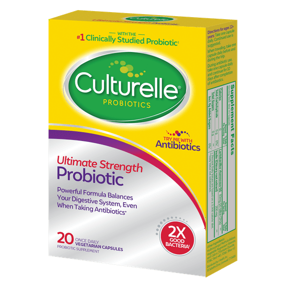 Clinical studies show that when you take the right amount, Lactobacillus rhamnosus GG can work to restore bacterial balance even when taking antibiotics. Support your body with 2X the good bacteria in Culturelle® Ultimate Strength Probiotic. Formulated with 20 billion CFUs, this powerful formula can restore balance every day, especially during high stressors like antibiotic use which kills both good & non-beneficial bacteria, or during travel.