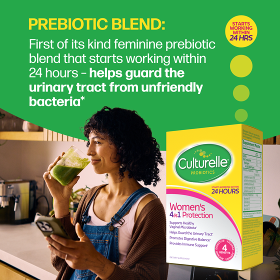 Culturelle® Women’s 4-in-1 Protection promotes women’s overall wellness, designed with a synergistic blend of probiotics and prebiotics that support your feminine microbiome with 4-in-1 protection that starts working within 24 hours. Each serving of this unique formula delivers 15 billion CFUs, combining clinically proven probiotic Lactobacillus rhamnosus GG for digestive and immune health with a clinically studied blend of four lactobacilli most commonly found in healthy women’s vaginal microbiomes. Plus, a first of its kind unique feminine prebiotic blend that helps guard the urinary tract from unfriendly bacteria.