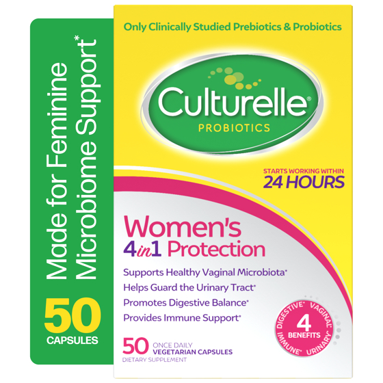 Culturelle® Women’s 4-in-1 Protection promotes women’s overall wellness, designed with a synergistic blend of probiotics and prebiotics that support your feminine microbiome with 4-in-1 protection that starts working within 24 hours. Each serving of this unique formula delivers 15 billion CFUs, combining clinically proven probiotic Lactobacillus rhamnosus GG for digestive and immune health with a clinically studied blend of four lactobacilli most commonly found in healthy women’s vaginal microbiomes. Plus, a first of its kind unique feminine prebiotic blend that helps guard the urinary tract from unfriendly bacteria.