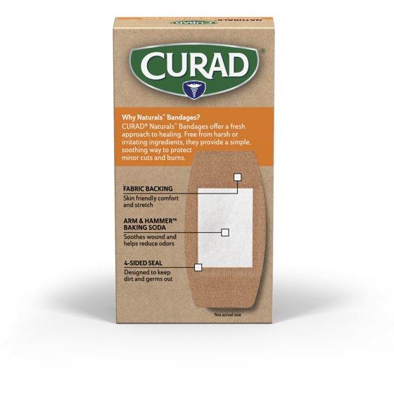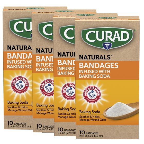 - FIRST-AID KIT ESSENTIALS: CURAD Naturals Bandages with Arm & Hammer Baking Soda are a great addition to your first aid kit. It contains 10 sterile 2” x 4” bandages for minor cuts and scrapes.