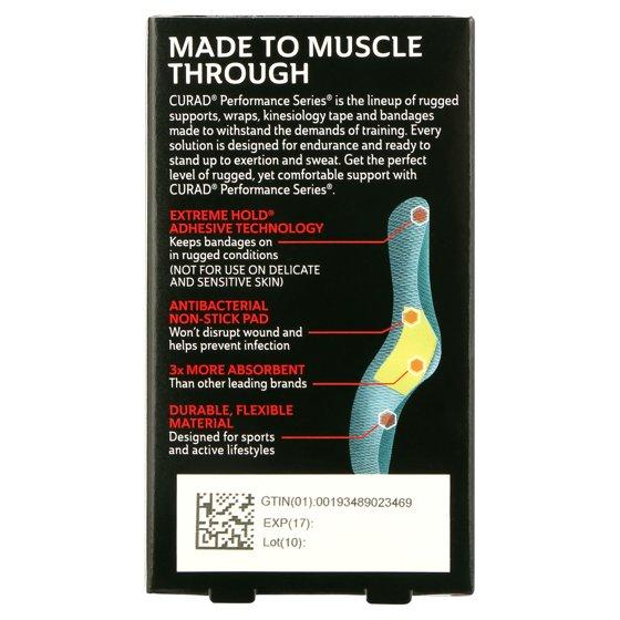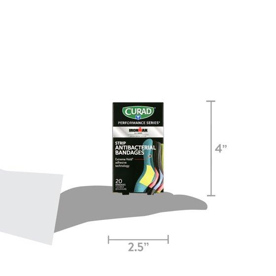 Part of the CURAD Performance Series, these Strip Antibacterial Ironman Bandages include a medicated absorbent pad with first-aid antiseptic. It helps prevent infection and protects cuts, scrapes or minor burns from dirt and germs. Nonstick pad won't disrupt the wound and features 0.8 percent benzalkonium chloride to help prevent infection. Extreme Hold adhesive technology with four-sided seal keeps the sterile bandage firmly in place and protects against dirt and germs. This extreme hold makes these bandages ideal to wear when active or playing sports. Durable, heavy-duty fabric offers outstanding protection for sports and active lifestyles. Rugged woven fabric conforms to body and flexes with movement. This product is intended for use on the body only.