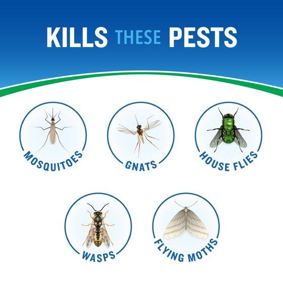. Stop read entire label before use. Directions for use. It is a violation of Federal law to use this product in a manner inconsistent with its labeling. For outdoor use only. Use Restrictions. Remove or cover exposed food and drinking water before application. Do not allow adults, children or pets to enter the treated area until sprays have dried. Do not use in enclosed porches. Do not apply this product in a way that will contact adults, children or pets, either directly or through drift. Do not allow people or pets to enter the treated areas until vapors, mists and aerosols have dispersed and the treated area has been thoroughly ventilated. • Do not water the treated area to the point of runoff. • Do not make applications during rain. • All outdoor applications must be limited to spot or crack-and-crevice treatments only, except for the following permitted uses:. 1. Treatment to soil or vegetation around structures. All outdoor applications to impervious surfaces such as sidewalks, driveways, patios, porches and structural surfaces (such as windows, doors and eaves) are limited to spot and crack-and-crevice applications only. • Application is prohibited directly into sewers or drains, or to any area like a gutter where drainage to sewers, storm drains, water bodies or aquatic habitat can occur. Do not allow the product to enter any drain during or after application. Shake well before using: Point spray nozzle away from face. Hold can at a slight downward angle. For best results, spray when air is calm. Allow a few minutes for product to take effect. Spray with wind if slight breeze is blowing (i.e., under 5 mph). Flying Insects. Flies, mosquitoes, flying moths, gnats and wasps: Spray area infested with these flying insects. Hold container 5 to 10 ft away from shrubs, bushes and grassy areas. Spray these areas with a slow, sweeping motion at the rate of one to three seconds per cubic yard of space while moving away from the treated area. To reduce annoyance from these pest, treat open porches and patios in a similar manner. Allow fog to drift over area. Give special attention to breeding areas such as garbage cans and compost piles. Spray only when the air is still. Allow spray to dissipate before occupying the treated area. Repeat as necessary, but no more than once per day. Crawling Insects. Ants (except carpenter, fire, pharaoh and harvester ants), crickets, sowbugs and firebrats: Spray infested surface of patio, campsite, deck or picnic area, hitting as many insects as possible. Also spray legs of tables and chairs to repel ants. Spray ant hills for best control. Keep 5 to 10 ft away from ornamental plants while spraying. Repeat as necessary, but no more than once per day.