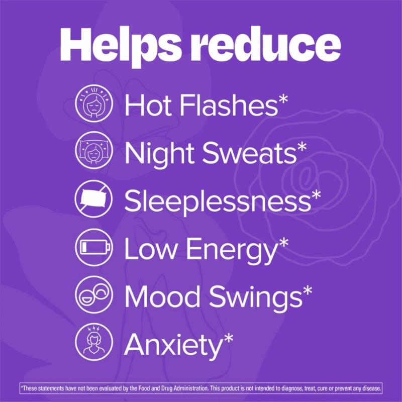 - Targeted Symptom Relief: Reduces hot flashes, night sweats, mood swings, sleeplessness, low energy, and anxiety.
