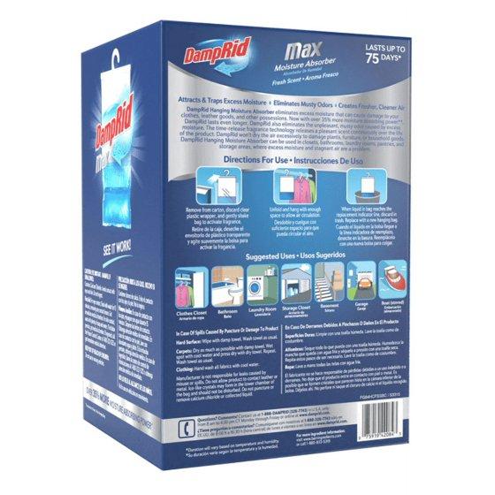 DampRid Hanging Bag Moisture Absorbers attract and trap excess moisture out of the air. Think of it as a dehumidifier without electricity, absorbing excess moisture to create and maintain optimal humidity levels wherever dampness and musty odors are a problem. Time-release fragrance technology releases a pleasant scent continuously over the life of the product. DampRid Hanging Bag Moisture Absorbers are ideal for closets, but they're also great for laundry rooms and storage areas where clothes and other fabrics often collect unpleasant, musty odors. These DampRid Moisture Absorbers offer 14% more moisture absorbing power compared to 14-ounce bags and can last up to 60 days depending on the temperature and level of humidity. When the liquid in the bag reaches the replacement indicator line, simply discard and replace. DON'T JUST COVER UP ODORS, ELIMINATE THEM: DampRid Fresh Scent Hanging Moisture Absorbers attract and trap excess moisture from the air, eliminating musty odors and creating fresher, cleaner air 14% MORE MOISTURE ABSORBING POWER*: You can see DampRid work as it attracts and traps excess moisture LONG-LASTING FRESHNESS: DampRid hanging bag moisture absorbers can last up to 60 days depending on temperature and humidity; ideal for use in closets to protect your clothes and leather goods from musty odors and moisture damage TIME-RELEASE FRAGRANCE TECHNOLOGY: Continuously releases a pleasant scent over the life of the product EASY TO USE: Simply remove from packaging, shake gently to activate fragrance and hang with enough space for air circulation; discard in trash when liquid reaches the replacement line Not for use in moving vehicles. Keep out of reach of children. Read & follow all label directions before use.