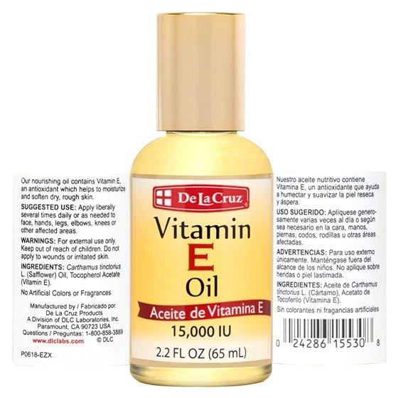 De La Cruz Vitamin E Oil is a blend of Safflower oil and 15,000 IU of the antioxidant Vitamin E to help moisturize dry and rough skin. The addition of Safflower oil makes it much less sticky than pure Vitamin E oil and more suitable for use on the body.