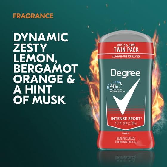 - ENERGIZING SCENT: Stay fresh with this deodorant. Degree Men Intense Sport Deodorant features a dynamic, zesty lemon and bergamot orange scent with a hint of musk.