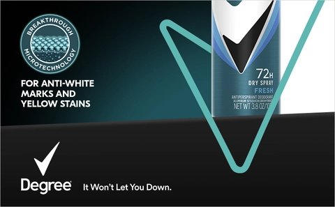 - WHITE SHIRT, BLACK SHIRT, NO PROBLEM: Degree Ultra Clear Fresh Antiperspirant Deodorant Dry Spray delivers 72-hour sweat and odor protection with anti-white marks and yellow stains technology