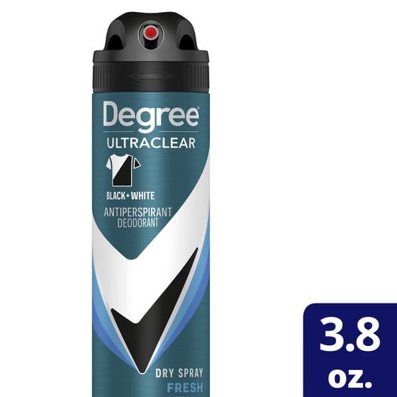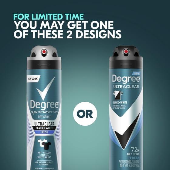 - WHITE SHIRT, BLACK SHIRT, NO PROBLEM: Degree Ultra Clear Fresh Antiperspirant Deodorant Dry Spray delivers 72-hour sweat and odor protection with anti-white marks and yellow stains technology