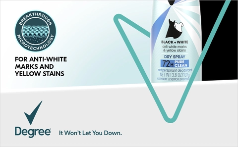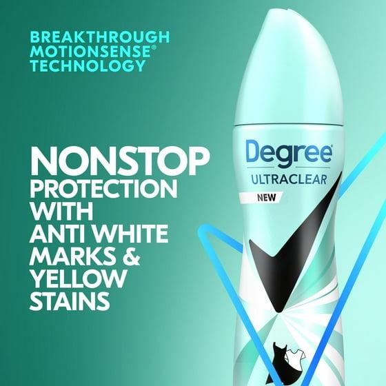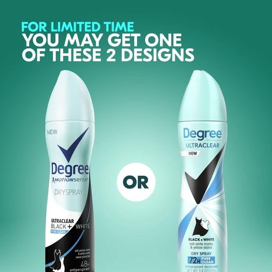 - WHITE SHIRT, BLACK SHIRT, NO PROBLEM: Degree UltraClear Black+White Pure Clean Antiperspirant Deodorant delivers 72-hour sweat and odor protection with anti-white mark and yellow stain technology.