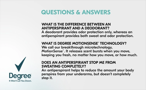 - GO BEYOND YOUR LIMITS: At Degree, we want to inspire the confidence in everyone to move more & go further. We’re here to support your journey through an antiperspirant deodorant that moves with you.