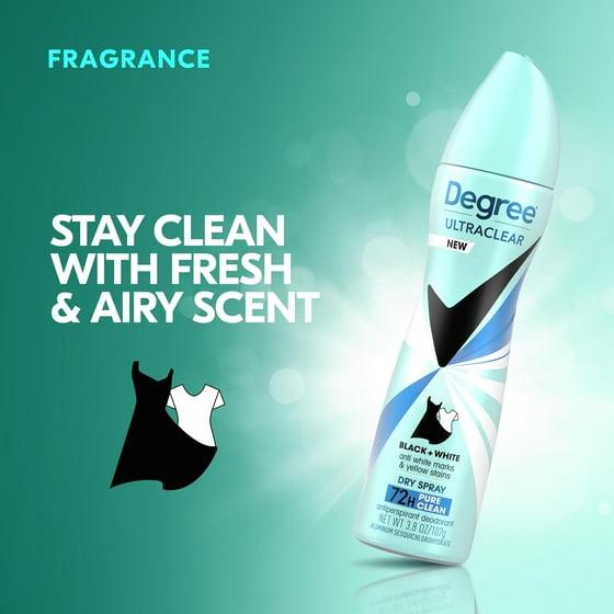 Stay fresh without marks or stains with Degree Women UltraClear Black+White Pure Clean Antiperspirant Deodorant Dry Spray. This antiperspirant deodorant dry spray combats stains and provides 72-hour sweat and odor protection with a light, airy scent to leave you feeling fresh all day.