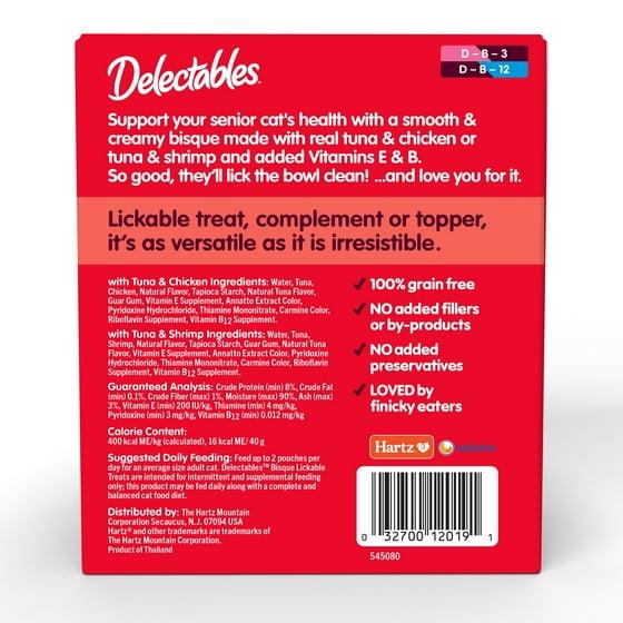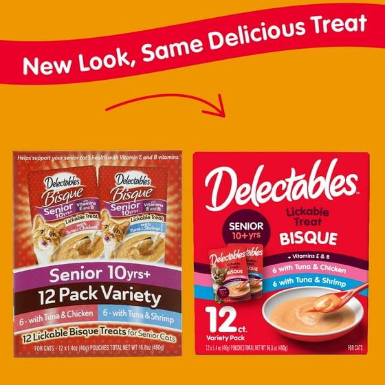 - BREADTH OF TEXTURES: Delectables offers a wide variety of textures supporting the overall health of senior cats 10+ years: Bisque, Stew, Chowder, and Squeeze Ups, the first interactive Cat Treat.