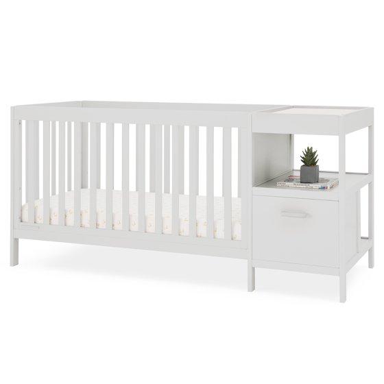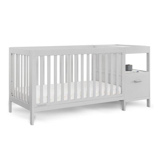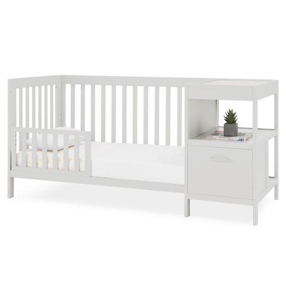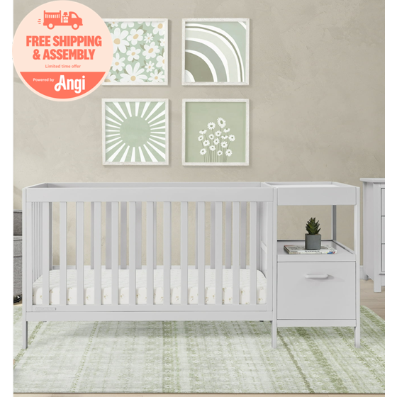 A modern all-in-one nursery, the Alice 5-in-1 Convertible Crib and Changer by Delta Children is all you need. Its clean lines make it the perfect centerpiece for any contemporary nursery. Designed to grow with your baby throughout life’s multiple stages, this crib features three mattress heights, and converts to toddler bed, daybed, sofa and full-size bed (Daybed Rail included; Toddler Guardrail #W100825 and standard full size metal bed frame sold separately). The attached changing table with changing pad, spacious drawer and two shelves provide tons of storage of nursery essentials. Plus, it’s GREENGUARD Gold Certified, which means it’s built to contribute to cleaner air for a healthy home. Crib mattress sold separately.