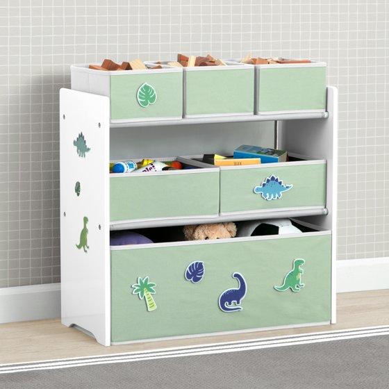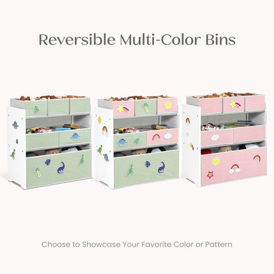 The Delta Children Design & Store 6 Bin Toy Storage Organizer with Interchangeable Patches is the perfect mix of fun and storage. This toy organizer comes with dinosaur and rainbow-themed hook and loop patches that allow children to give the bins a customized look by continually moving them around. Little ones can rearrange the patches on the fronts of the bins for hours of endless storytelling, adding a much-needed incentive to clean-up time. For even more customization, you can choose which color bins to showcase. The six fabric bins feature green on one end and pink on the other--choose to showcase all green or all pink or alternate green and pink bins for a colorful look. The sturdy wooden frame holds six fabric bins sized for every type of toy, so you can store books, blocks, and more. An eye-popping addition to their playroom or bedroom, this toy organizer makes cleaning quick and easy.