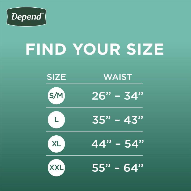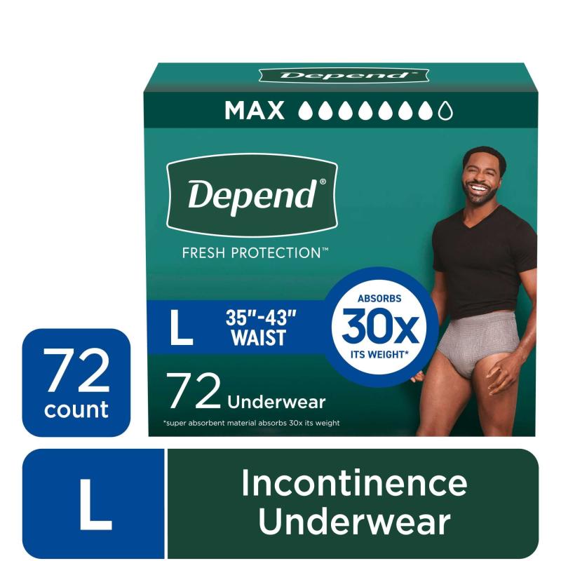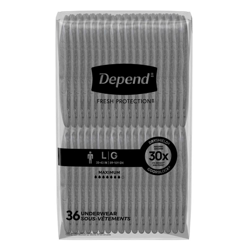 - DEPEND FRESH PROTECTION: 28 count of Depend Fresh Protection Incontinence Underwear for Men, size large (35–43" waist)