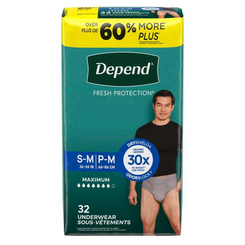 - DEPEND FRESH PROTECTION: 32 count of Depend Fresh Protection Incontinence Underwear for Men, size small/medium (26–34" waist)
