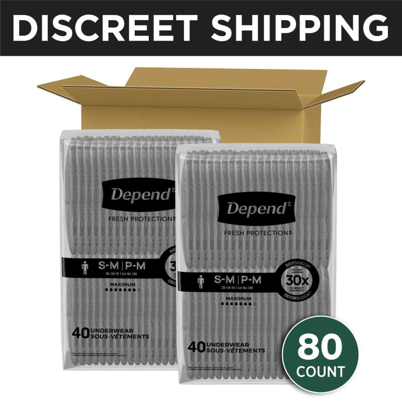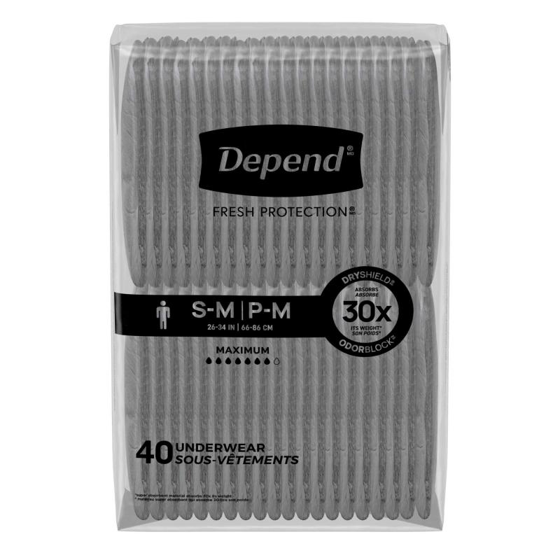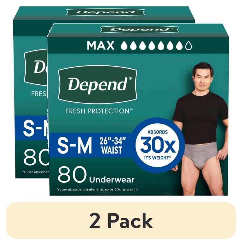 - DEPEND FRESH PROTECTION: 32 count of Depend Fresh Protection Incontinence Underwear for Men, size small/medium (26–34" waist)