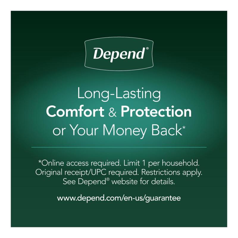 Get Trusted Depend® Protection and Comfort or Your Money Back Depend® Money Back Guarantee We are committed to providing the best experience to our customers. Purchase any Depend® product and if you are not completely satisfied, we’ll give you your money back. Here’s how to get your money back: Step 1: Download, print and complete by hand and in full the Money Back Guarantee Form - https://www.depend.com/en-us/guarantee Step 2: Enclose all of the following in an envelope: a. The original completed Money Back Guarantee Form. b. An unmodified store register receipt with any (limit one) Depend® product purchased between 1/1/25 – 12/31/25. Please circle product purchased and date on store receipt. c. The original UPC Code from the package. UPC Code must match offer packaging. Step 3: Mail all items listed above within 30 days of your purchase date with the proper postage to: Depend® Money Back Guarantee PO Box 717 North Branford, CT 06471