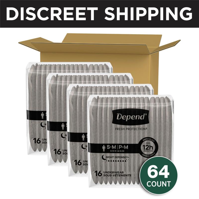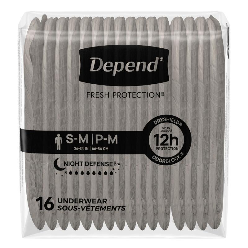 - DEPEND NIGHT DEFENSE: 16 count of Depend Night Defense Adult Incontinence Underwear for Men, size small/medium (26–34" waist)