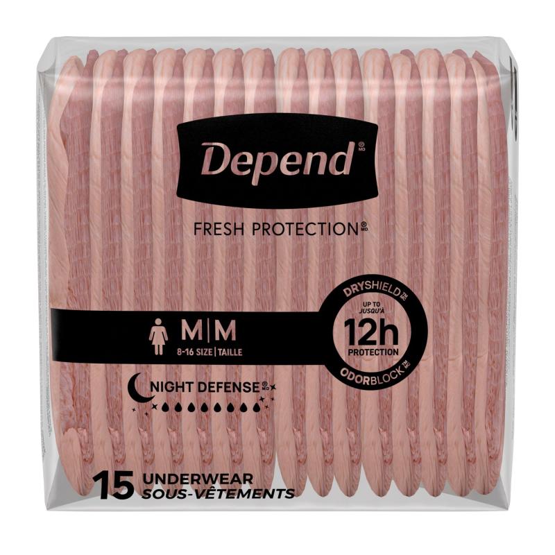 - DEPEND NIGHT DEFENSE: 15 count of Depend Night Defense Incontinence Underwear for Women, size medium (31–37" waist)