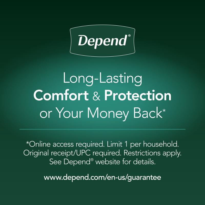 Get Trusted Depend® Protection and Comfort or Your Money Back Depend® Money Back Guarantee We are committed to providing the best experience to our customers. Purchase any Depend® product and if you are not completely satisfied, we’ll give you your money back. Here’s how to get your money back: Step 1: Download, print and complete by hand and in full the Money Back Guarantee Form - https://www.depend.com/en-us/guarantee Step 2: Enclose all of the following in an envelope: a. The original completed Money Back Guarantee Form. b. An unmodified store register receipt with any (limit one) Depend® product purchased between 1/1/25 – 12/31/25. Please circle product purchased and date on store receipt. c. The original UPC Code from the package. UPC Code must match offer packaging. Step 3: Mail all items listed above within 30 days of your purchase date with the proper postage to: Depend® Money Back Guarantee PO Box 717 North Branford, CT 06471
