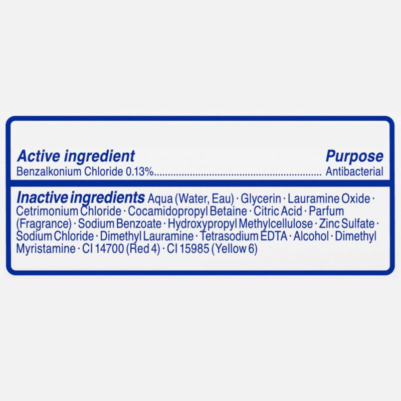 Active ingredient Purpose Benzalkonium Chloride 0.13%. . . . . . . . . . . . . . . . . . Antibacterial Inactive ingredients: Aqua (Water, Eau) · Glycerin · Cetrimonium Chloride · Lauramine Oxide · Cocamidopropyl Betaine · Sodium Benzoate · Parfum (Fragrance) · Citric Acid · Zinc Sulfate · Aloe Barbadensis Leaf Juice · Sodium Chloride · Trisodium Ethylenediamine Disuccinate · Alcohol · Dimethyl Lauramine · CI 15985 (Yellow 6) · CI 14700 (Red 4)