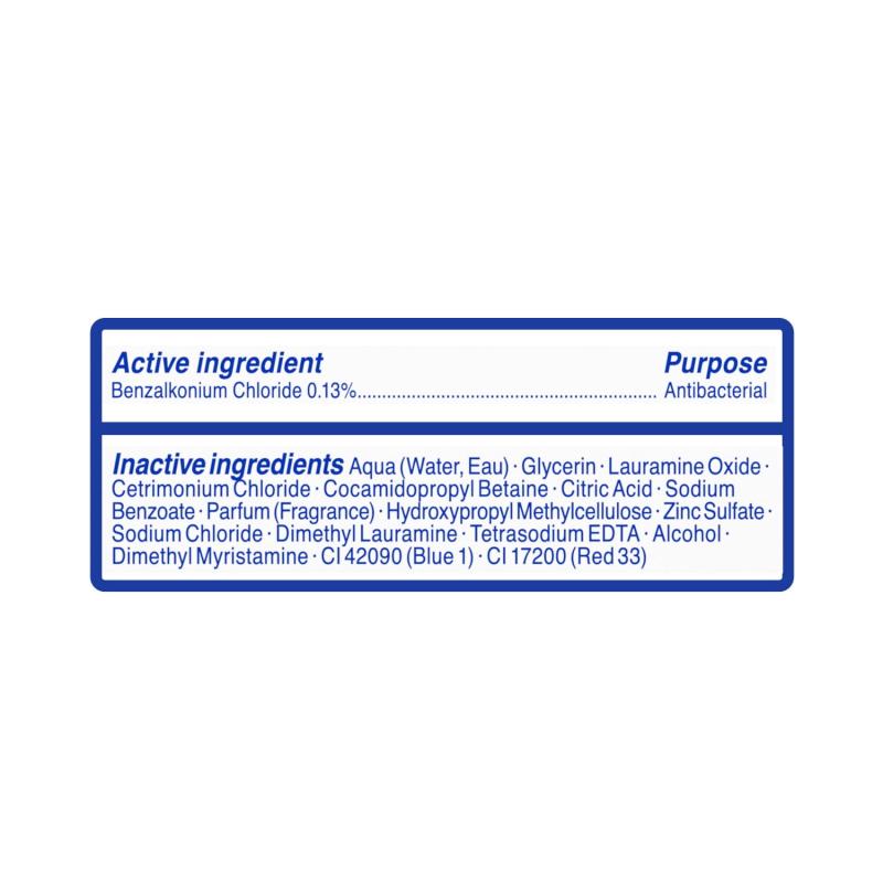 Active ingredient Purpose Benzalkonium Chloride 0.13%. . . . . . . . . . . . . . . . . . Antibacterial Inactive ingredients: Aqua (Water, Eau) · Glycerin · Cetrimonium Chloride · Lauramine Oxide · Cocamidopropyl Betaine · Sodium Benzoate · Parfum (Fragrance) · Citric Acid · Zinc Sulfate · Aloe Barbadensis Leaf Juice · Sodium Chloride · Trisodium Ethylenediamine Disuccinate · Alcohol · Dimethyl Lauramine · CI 42090 (Blue 1) · CI 17200 (Red 33)