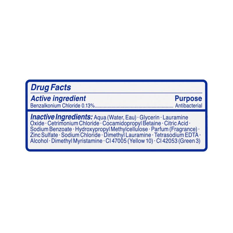 Active Ingredients: Benzalkonium Chloride (0.13 %), Antibacterial. Inactive Ingredients: Aqua (Water, Eau), Glycerin, Lauramine Oxide, Cetrimonium Chloride, Cocamidopropyl Betaine, Citric Acid, Sodium Benzoate, Hydroxypropyl Methylcellulose, Parfum (Fragrance), Zinc Sulfate, Sodium Chloride., Dimethyl Lauramine, Tetrasodium EDTA, Alcohol, Dimethyl Myristamine, CI 47005 (Yellow 10), CI 42053 (Green 3).