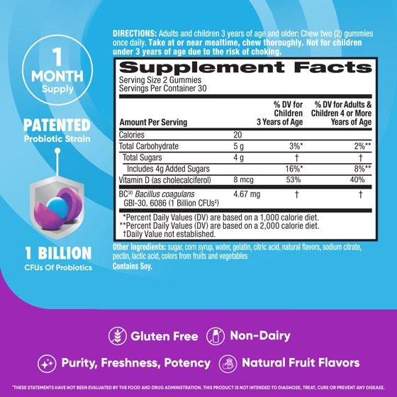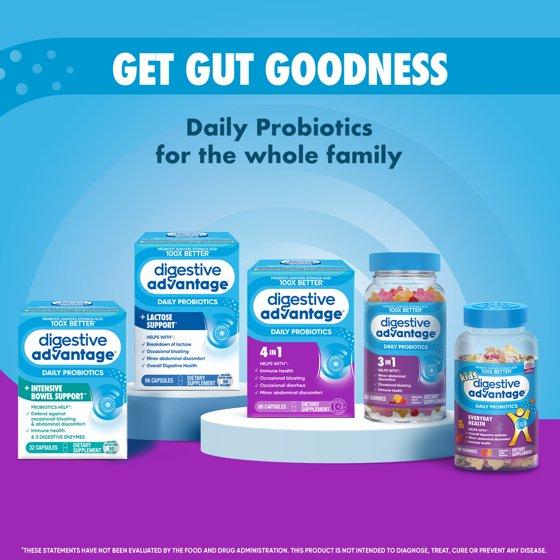 Digestive Advantage Probiotic Gummies are the easiest and most delicious way to get your daily probiotics while targeting your specific digestive health needs. Digestive Advantage helps to lessen minor abdominal discomfort, bloating and may relieve occasional diarrhea*. The unique patented probiotic in Digestive Advantage Probiotic Gummies, BC30, is protected by a protein shell which allows it to survive through the harsh conditions of your stomach to reach the intestines where you need it most to promote long term digestive and immune health*. It's the probiotic supplement that survives stomach acid 100x better than yogurt and leading probiotics** *These statements have not been evaluated by the Food and Drug Administration. This product is not intended to diagnose, treat, cure or prevent any disease. **Based on median % survivability of Digestive Advantage probiotic vs. leading probiotic supplements and 19 probiotic yogurts in simulated gastric PH for 2 hours. Survivability and delivery of probiotic cells to the small and large intestines is one of the several factors influencing overall product effect.