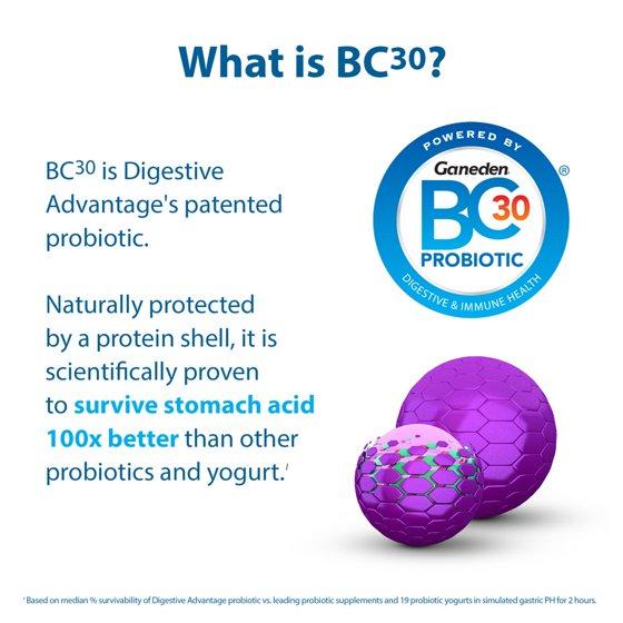 - BC30, the probiotic in Digestive Advantage, survives stomach acid 100x better than leading probiotics and yogurts