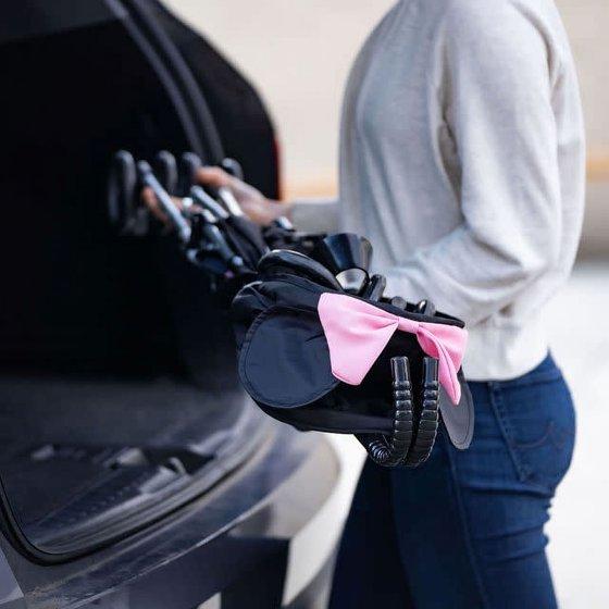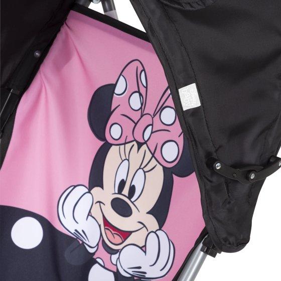 Add some magic to your baby's day with a Disney Baby Umbrella Stroller that features a fun Disney design that'll have everyone grinning from ear to ear. The covered handles have extra height to make pushing more comfortable for Mom or Dad and the storage basket underneath is the perfect place to stow items during the ride. The stroller features a three-point harness and lockable rear wheels to keep kiddos safe and a footrest provides them more comfort during a stroll. A fun canopy featuring Mickey or Minnie Mouse provides protective shade from sunshine and bright lights above. You'll also love the lightweight frame which makes it easy to carry and perfect to use every day or when you’re traveling on a family vacation. The compact fold lets you take it along in the car or hide it in a closet when not needed. Great for your own home, or as an easy-to-store stroller the family keeps handy at grandma's house. The maximum weight for this stroller is 40 lbs.