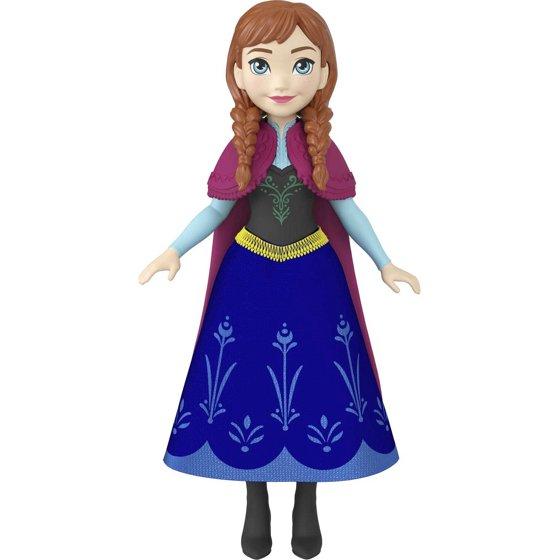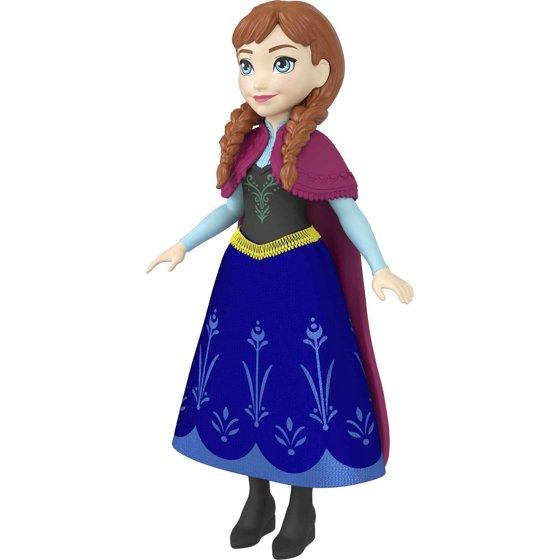 - In an adorable small scale (3.5 inches), this Anna doll wears her blue and purple travel outfit from the movie with a removable soft plastic cape and fabric skirt