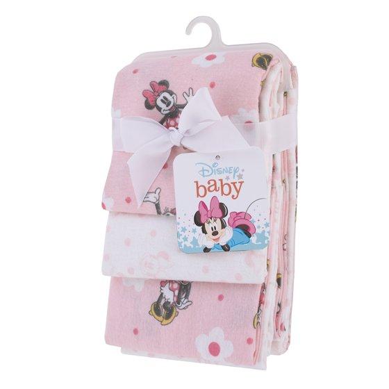 Cuddle your baby girl in soft comfort with the Disney Minnie Mouse Hello Gorgeous 4-Piece Flannel Receiving Blankets. These lightweight blankets are made from soft, 100% cotton brushed flannel, making them a perfect choice for your baby girl. Use for a variety of needs, such as swaddling, to take on-the go, or during feeding time for burping and cleaning spit up. The 4-pack has 2 different prints - one features Minnie Mouse and delicate white flowers on a pink background; the other has a pink silhouette print of Minnie's face, with small pink polka dots on a white background. Each blanket measures 30" x 30" and is machine washable for easy care.