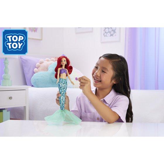 - Ariel doll's top has a satin ribbon neckline, and her shimmery mermaid tail features a scale print and soft tail – perfect for storytelling adventures!