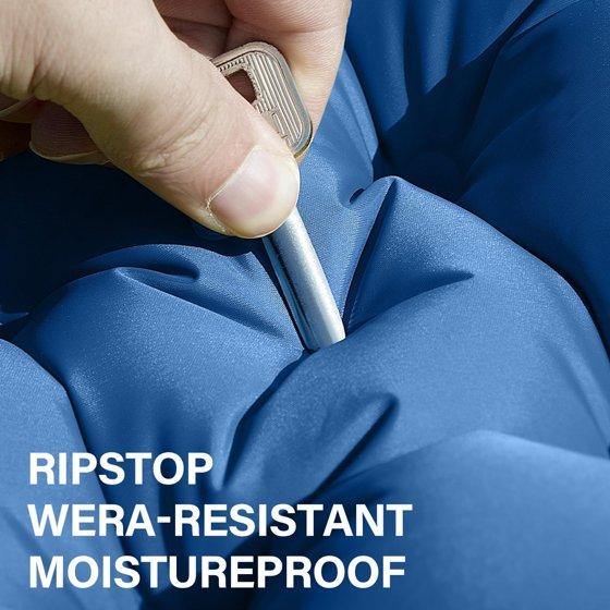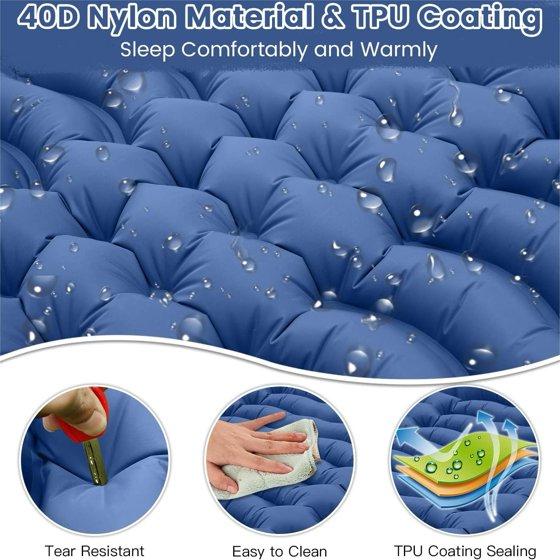 - HEAVY DUTY RIPSTOP NYLON FABRIC: Camping sleeping pad made of outdoor grade material 40D nylon and inner TPU sealing coating, waterproof, hard wearing, no tearing and easy to clean. which is born for all kinds of harsh outdoor environments. Sleep tight even when you're lying on the rugged ground, keeps you comfortable all night long.