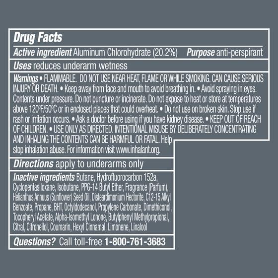 Active Ingredients: Aluminum Chlorohydrate (20.2 %), Anti-Perspirant. Inactive Ingredients: Butane, Hydrofluorocarbon 152A, Cyclopentasiloxane, Isobutane, PPG-14 Butyl Ether, Fragrance (Parfum), Helianthus Annuus (Sunflower) Seed Oil, Disteardimonium Hectorite, C12-15 Alkyl Benzoate, Propane, BHT, Octyldodecanol, Propylene Carbonate, Dimethiconol, Tocopheryl Acetate, Alpha-Isomethyl Ionone, Butylphenyl Methylpropional, Citral, Citronellol, Coumarin, Hexyl Cinnamal, Limonene, Linalool.