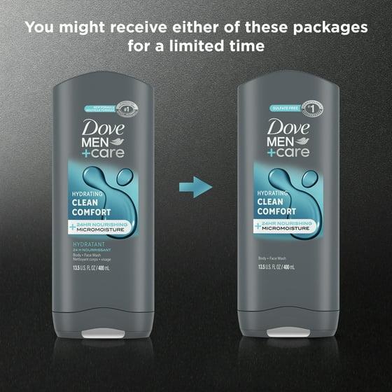 - MADE WITH CARE: Dove Men+Care hydrating Clean Comfort body wash is certified cruelty-free by PETA and made in 100% recycled plastic bottles