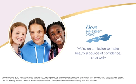 Dove Invisible Solid Powder Antiperspirant Deodorant provides all-day sweat and odor protection with a comforting baby powder scent. Our nourishing formula with 1/4 moisturizers is kind to underarms and leaves skin feeling soft and smooth.